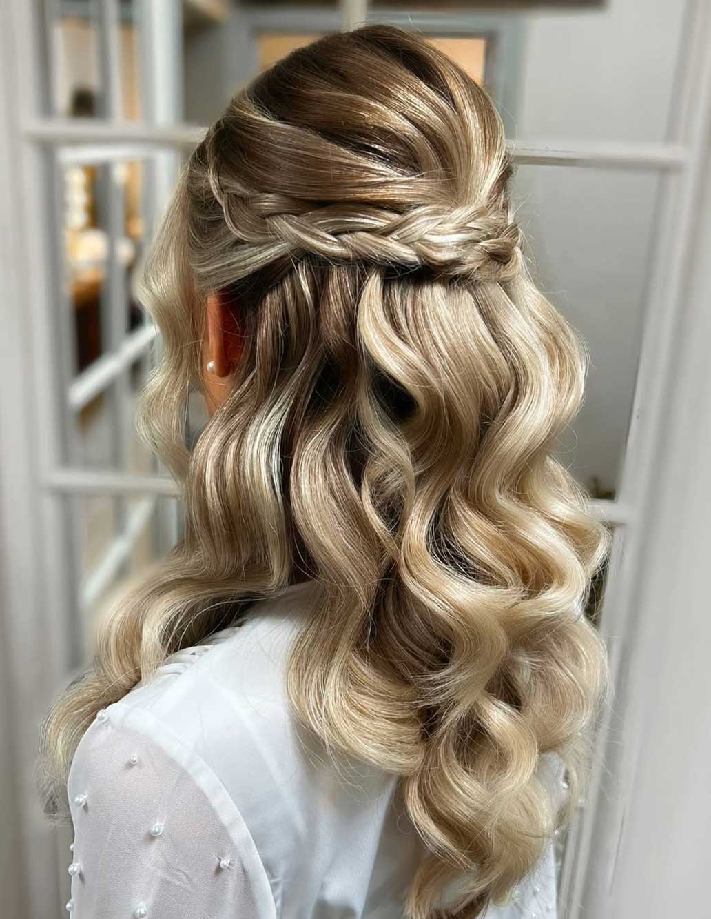 Con i capelli di media lunghezza, il semiraccolto può essere giocato sulle onde. Si può creare una piega mossa, raccogliendo solo la parte superiore e lasciando libere le punte sulle spalle. Un piccolo intreccio, un fermaglio gioiello o un nastro in raso aggiungono un tocco romantico, perfetto per cerimonie diurne o outdoor.