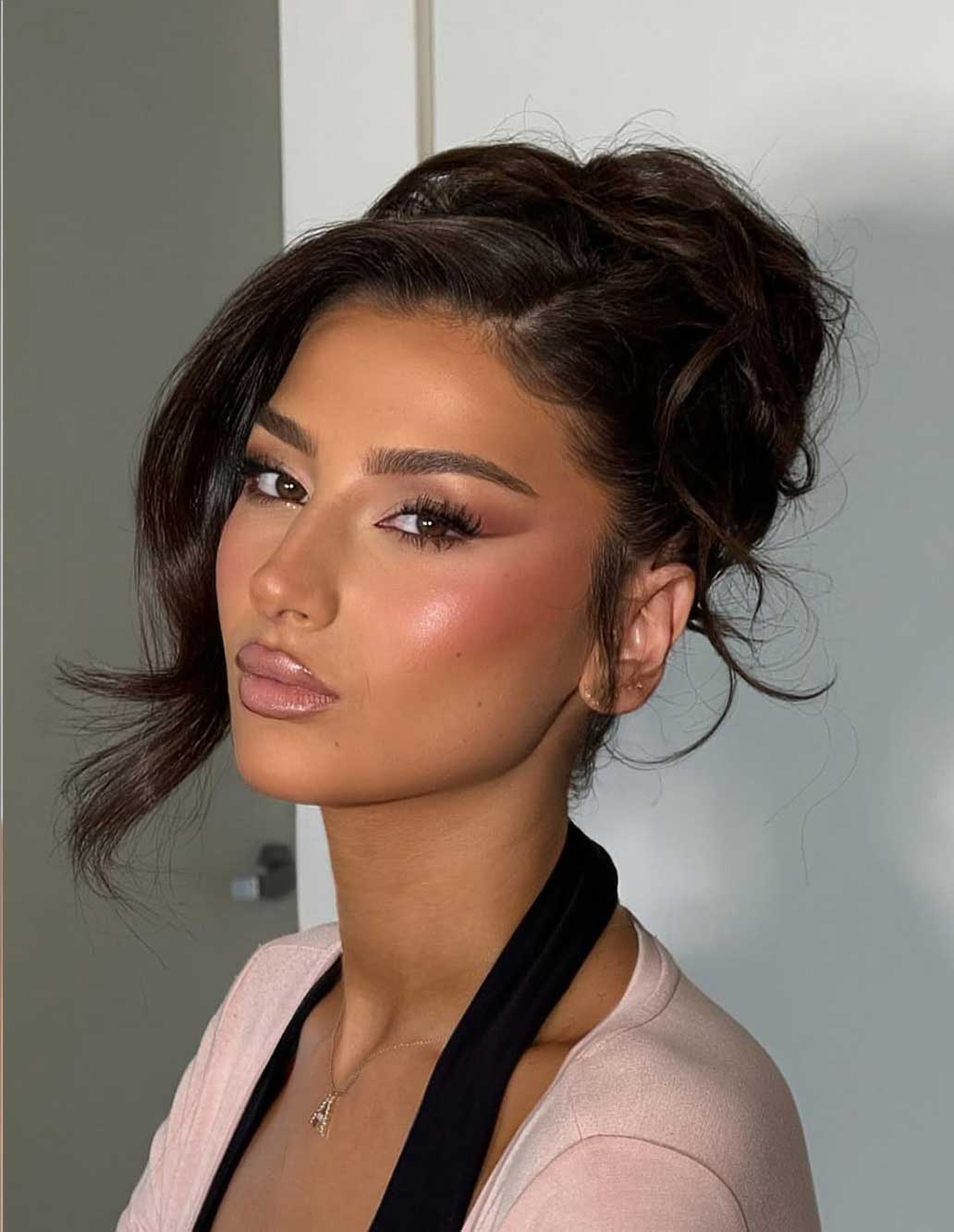 Lo chignon alto, invece, si posiziona al centro o leggermente sopra la sommità della testa e dona subito un’aria più moderna e dinamica. È perfetto se hai un abito con la schiena scoperta o spalle importanti, perché slancia la figura e lascia il collo completamente libero. Può essere liscio e lucidissimo, effetto “balletto” (ideale per eventi serali o più eleganti), oppure più morbido e voluminoso, con una base leggermente cotonata per dare struttura. Chi ama lo stile glam può abbinarlo a un fermaglio gioiello sulla base del raccolto, mentre chi punta su qualcosa di più fresco può completarlo con un cerchietto sottile o una fascia annodata.
