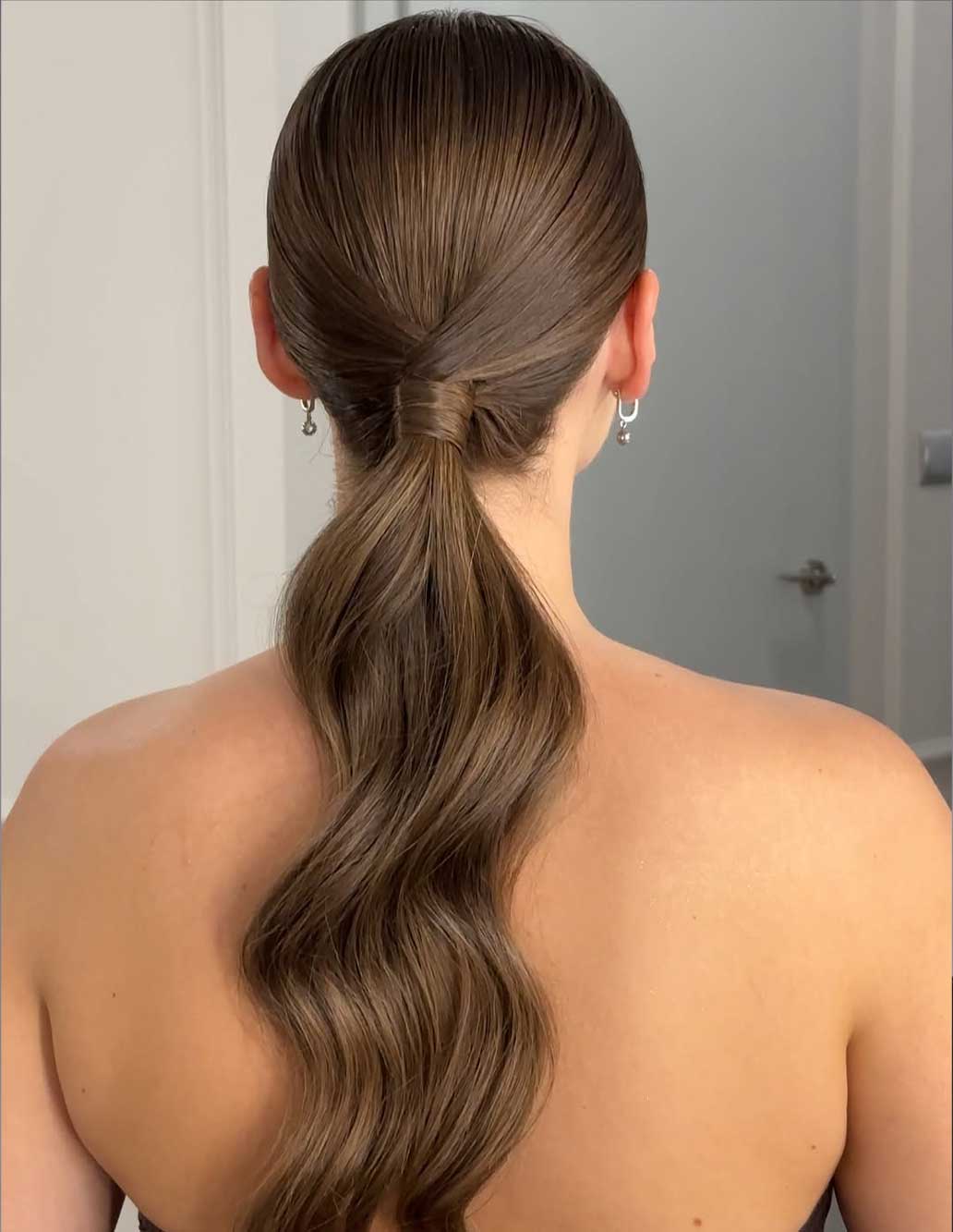 La coda è molto più di una soluzione pratica: se ben realizzata, può trasformarsi in un’acconciatura da cerimonia elegante, pulita e decisamente d’effetto. L’opzione più raffinata è la coda bassa, liscia o leggermente ondulata, fissata con una ciocca avvolta attorno all’elastico per nascondere l’attacco. Perfetta per matrimoni civili, cerimonie serali o eventi formali, funziona particolarmente bene con abiti dalle linee minimal o con scollo profondo sulla schiena.