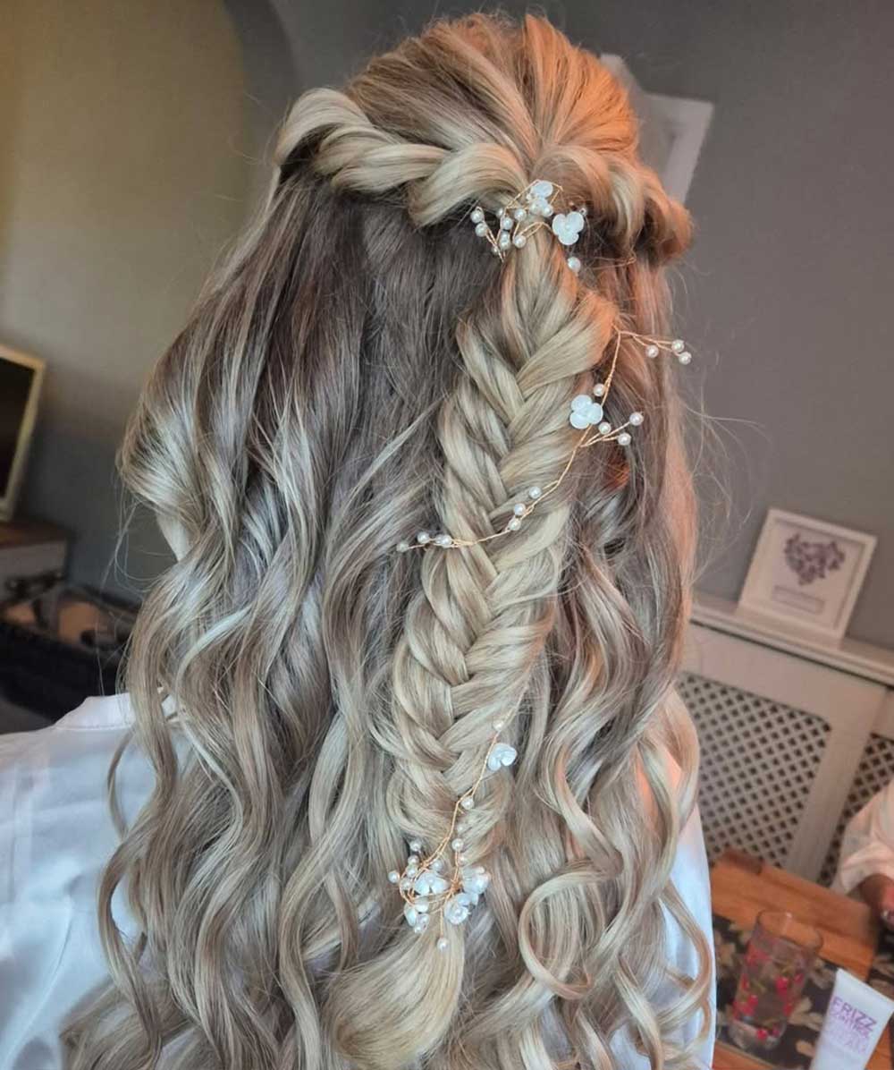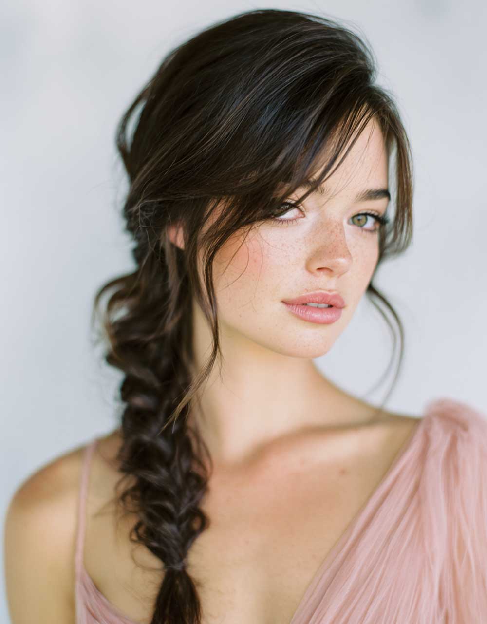 Elegante e molto fotogenica, la treccia laterale è una delle opzioni più versatili. Sta bene su capelli medi e lunghi e può essere interpretata in versione più ordinata o leggermente morbida, a seconda dello stile del matrimonio. È perfetta per chi desidera un’acconciatura semplice ma curata, capace di valorizzare il viso senza risultare troppo costruita.