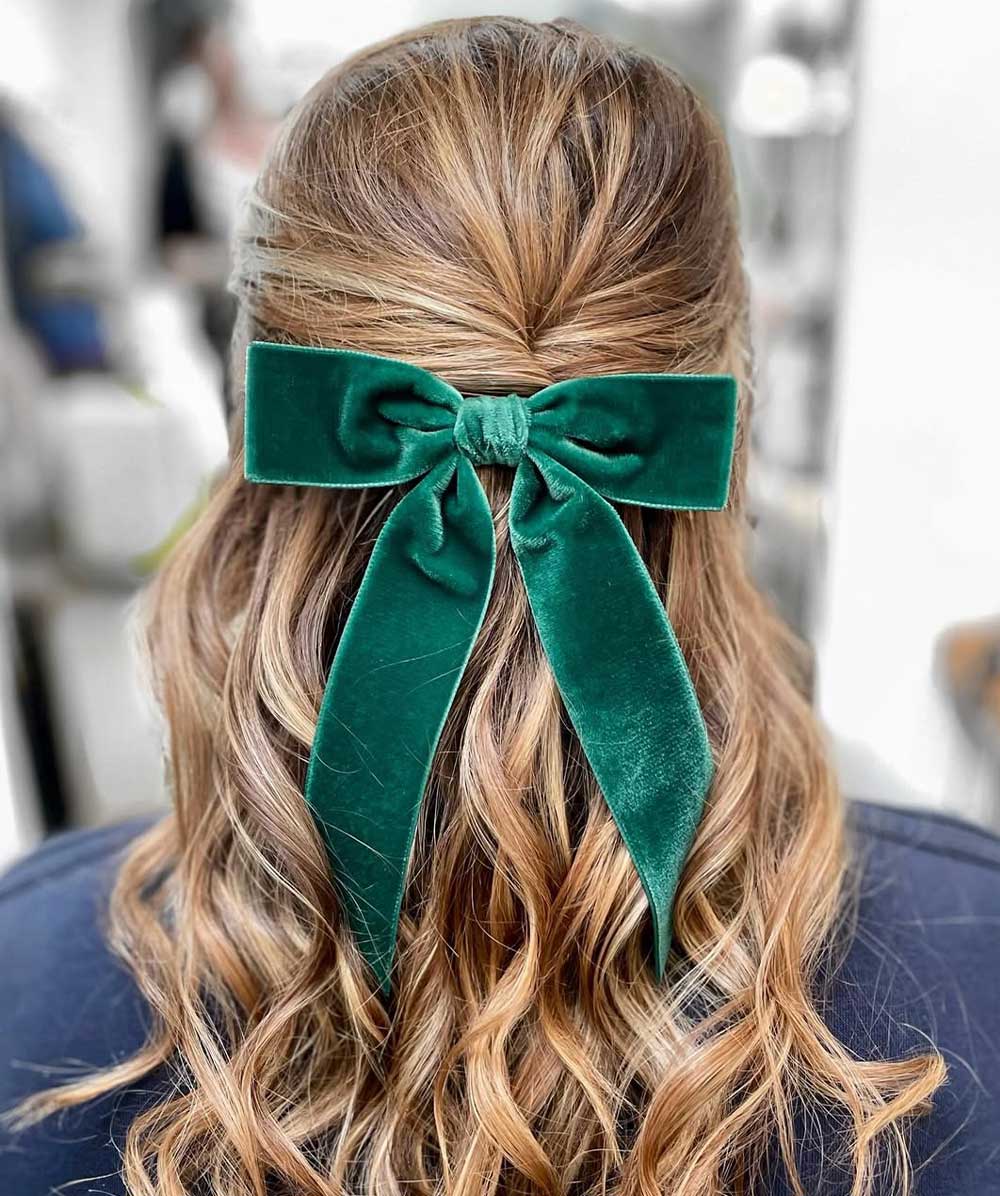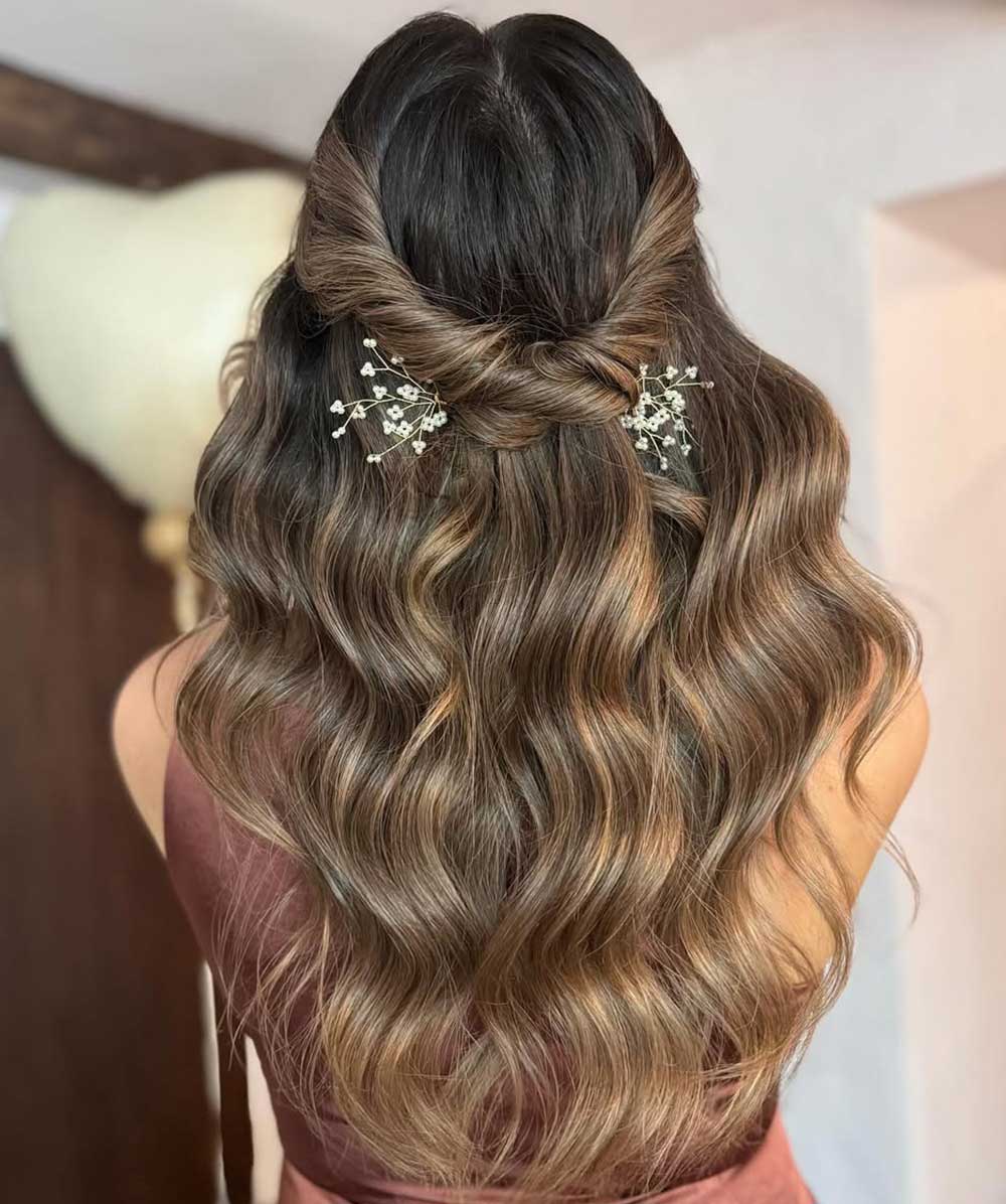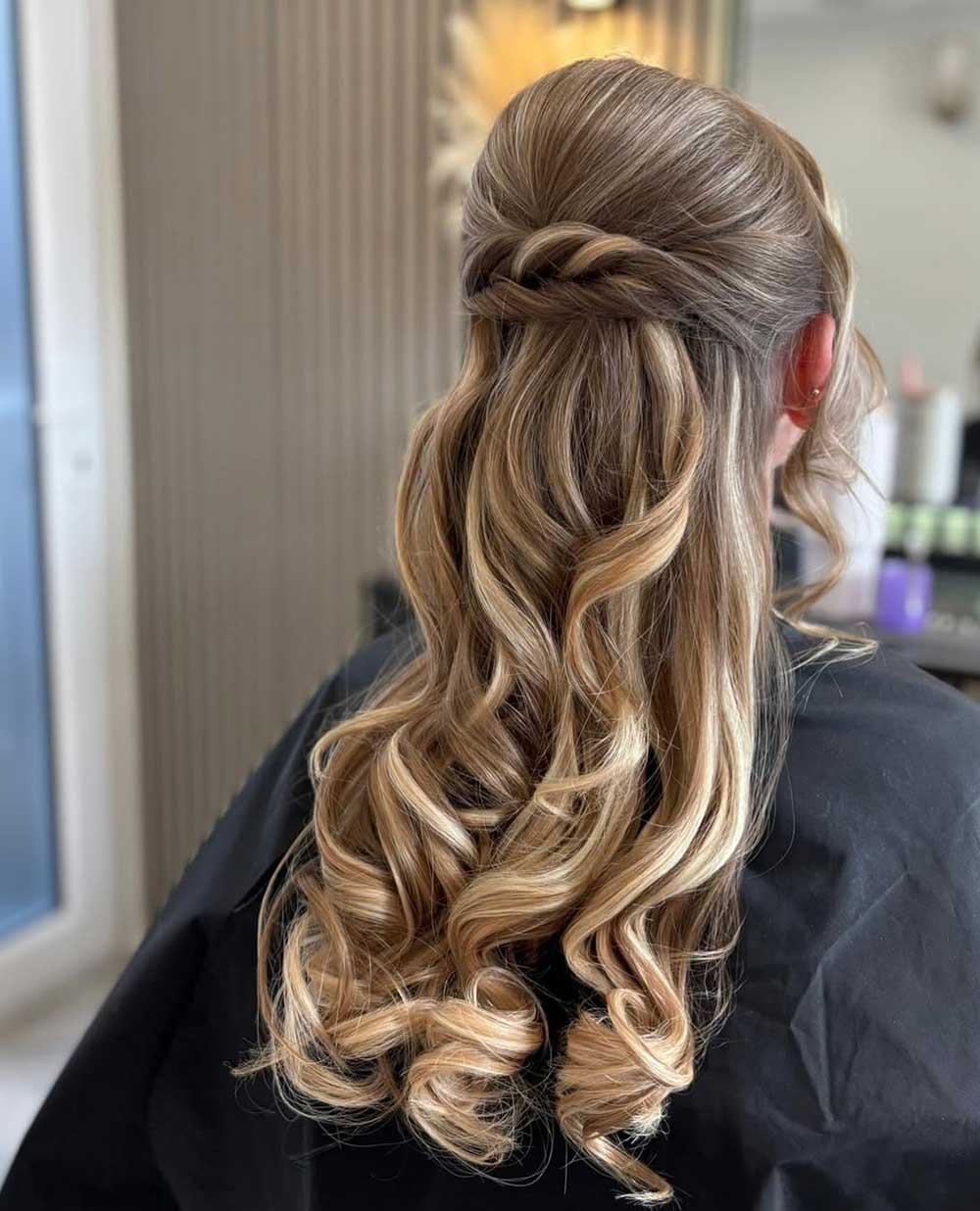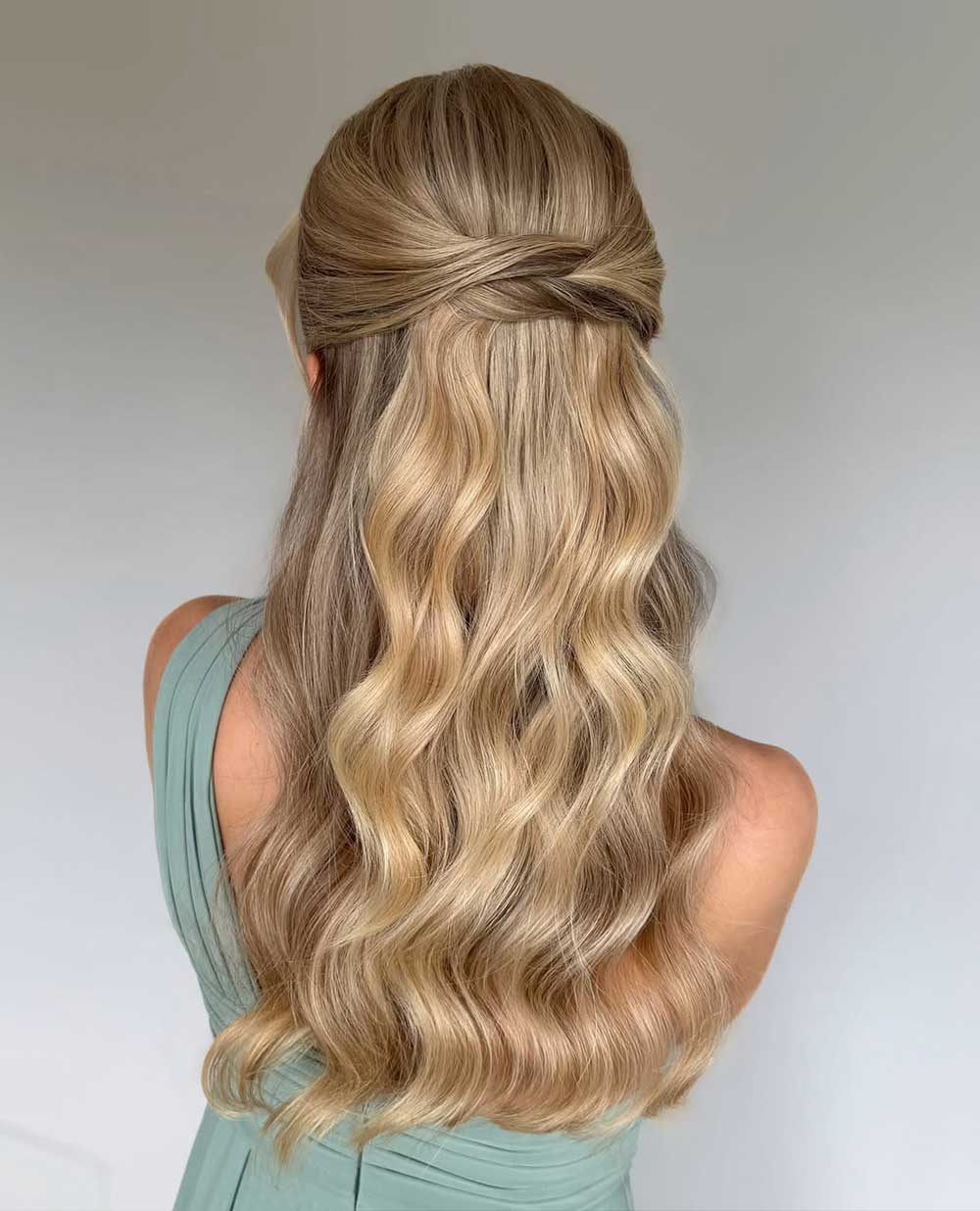 È la versione più scelta, perché dona subito movimento e luminosità. Le lunghezze restano sciolte e leggermente mosse, mentre la parte superiore dei capelli viene fissata sul retro. Funziona benissimo su capelli medi e lunghi, ma sorprende anche su caschetto e tagli alle spalle, soprattutto se i capelli sono leggermente ondulati. Uno dei grandi vantaggi di questa acconciatura è la sua semplicità. Con un buon ferro per creare le onde e qualche forcina ben posizionata, può essere realizzata anche a casa. Lasciare volutamente qualche ciocca morbida attorno al viso aiuta a mantenere l’effetto naturale e leggero.