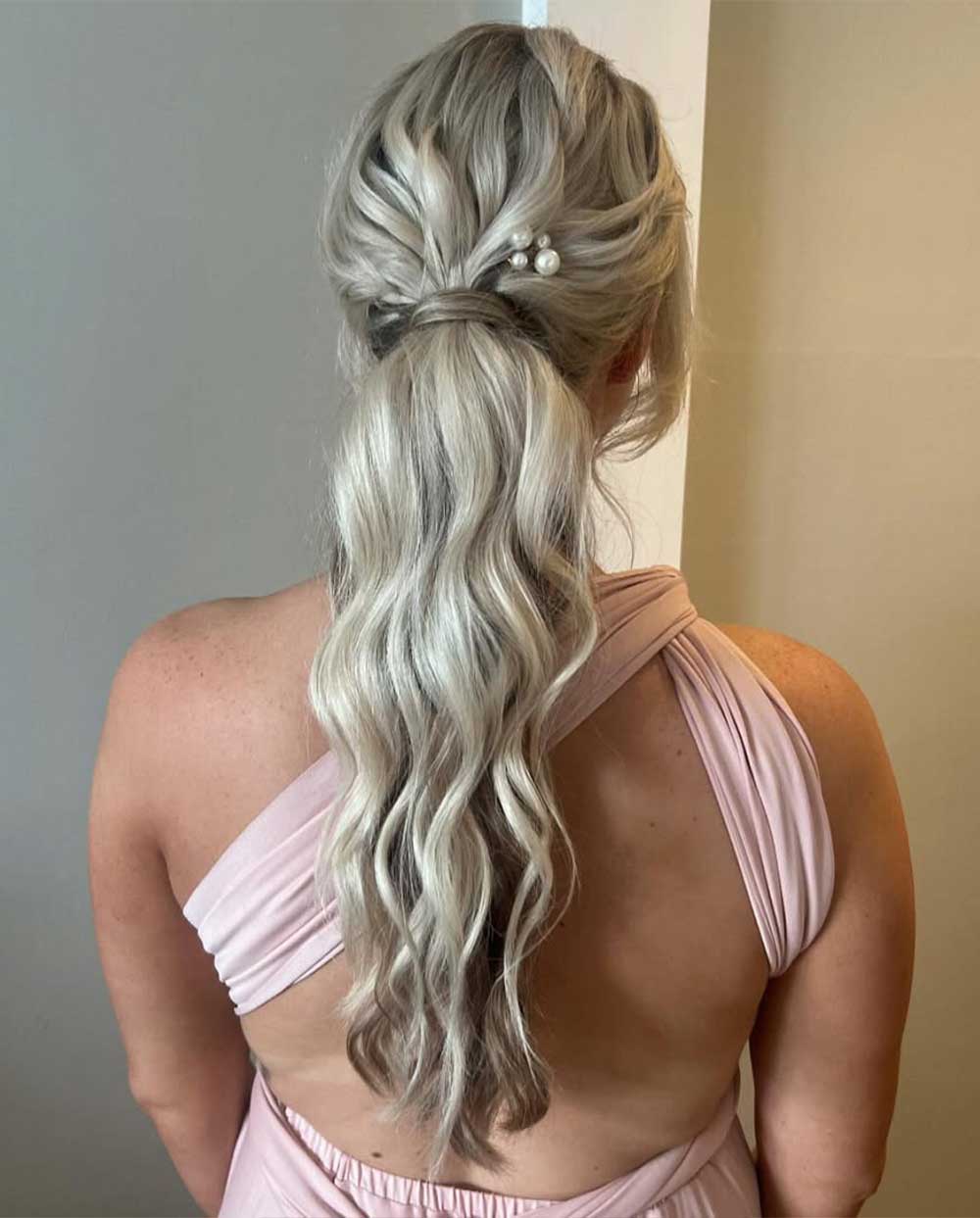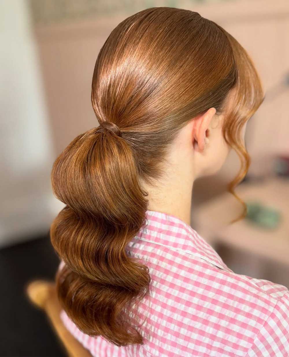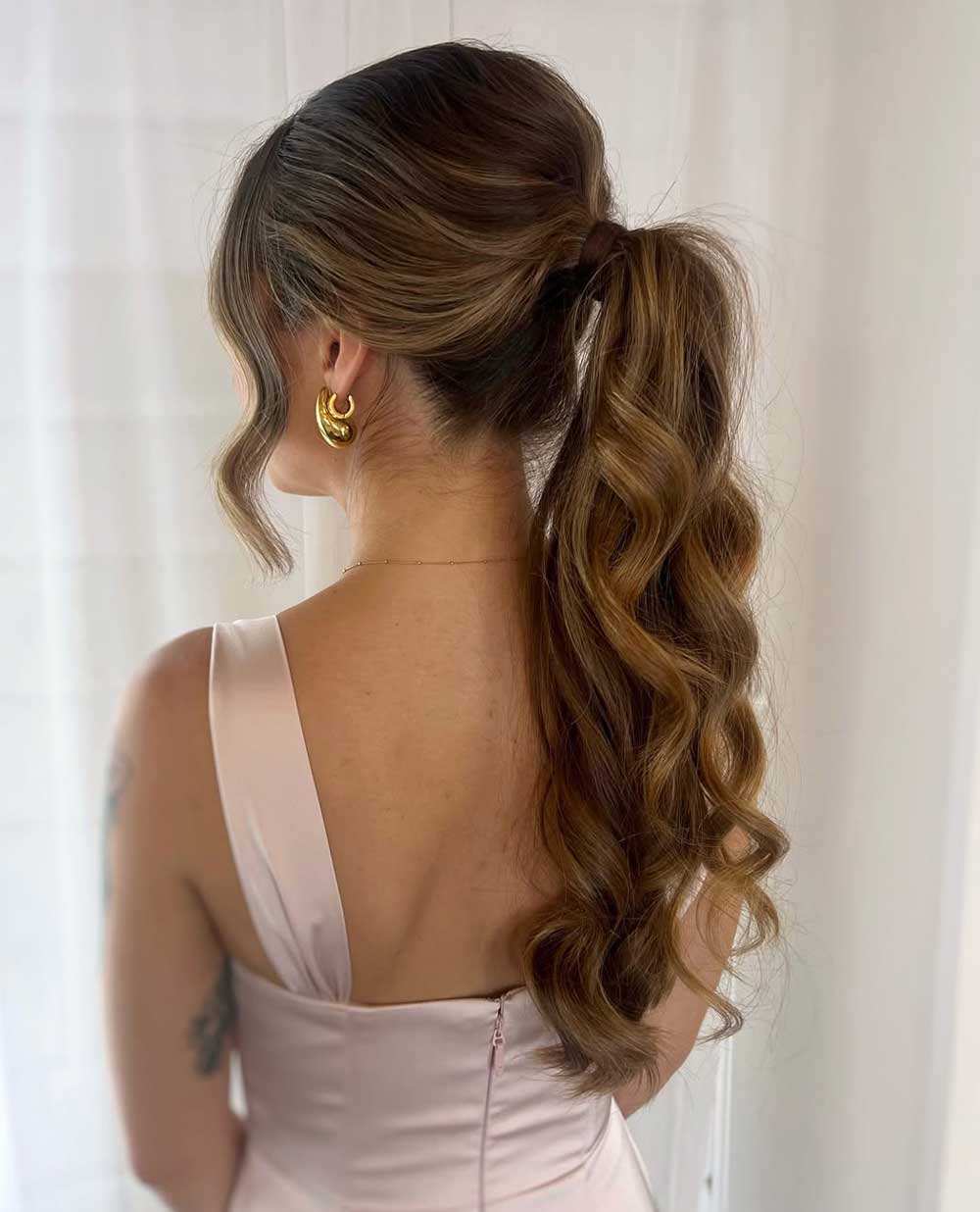 Accanto a questa versione più rigorosa, funziona molto bene anche la coda medio-alta morbida, con radici lisce e lunghezze lavorate a onde regolari. È una variante più versatile e romantica, ideale per cerimonie all’aperto o per chi desidera un look ordinato ma meno strutturato. Mantiene il viso libero, regge bene per tutta la giornata e valorizza in modo naturale la schiena dell’abito.