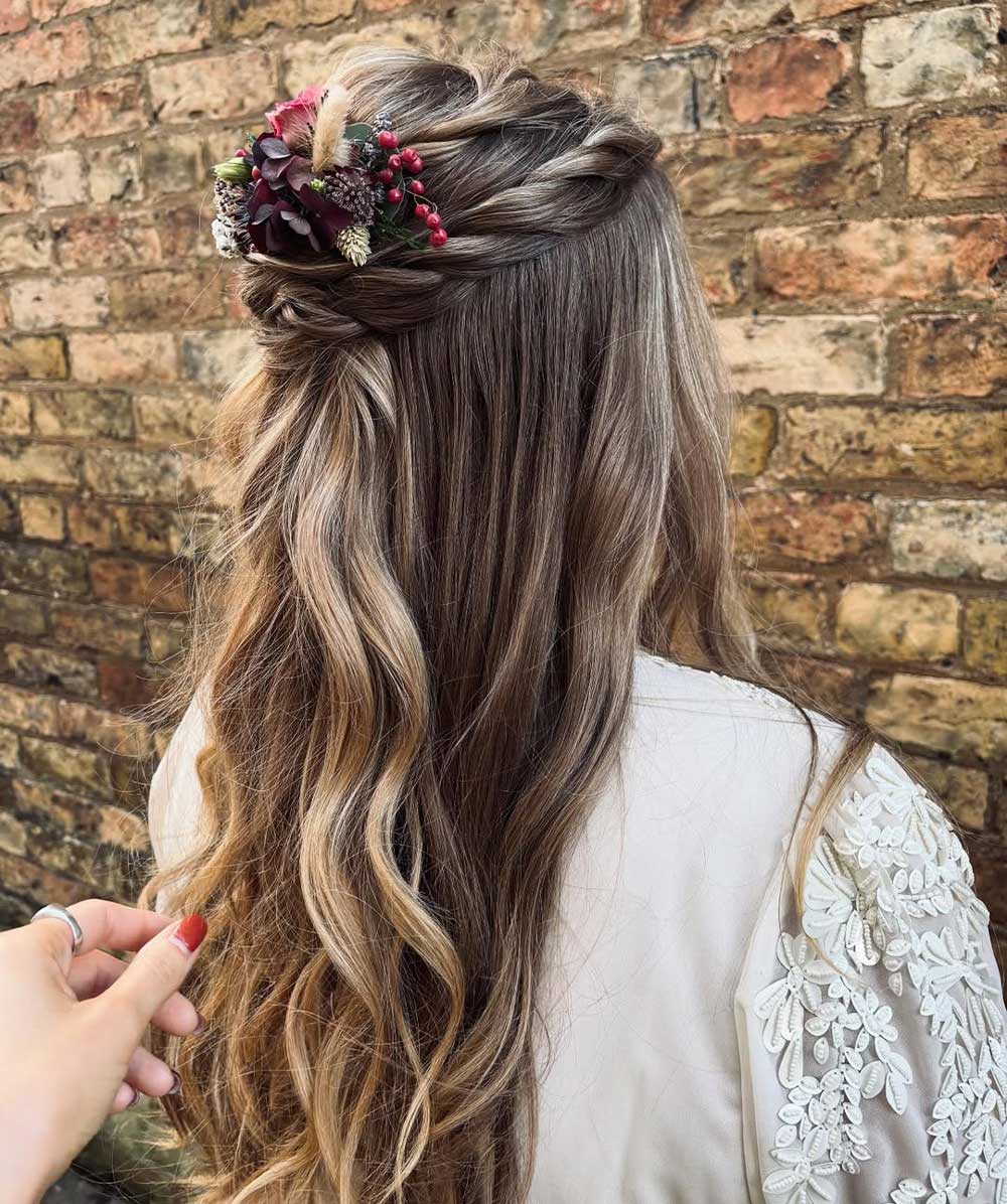 Perfetto per chi ama un tocco boho o romantico. Piccoli intrecci che partono dai lati e si incontrano dietro la testa aggiungono carattere senza appesantire l’insieme. È una soluzione ideale per matrimoni in giardino, in campagna o sul mare, e si adatta anche a capelli non troppo lunghi, scegliendo trecce sottili o twist morbidi.