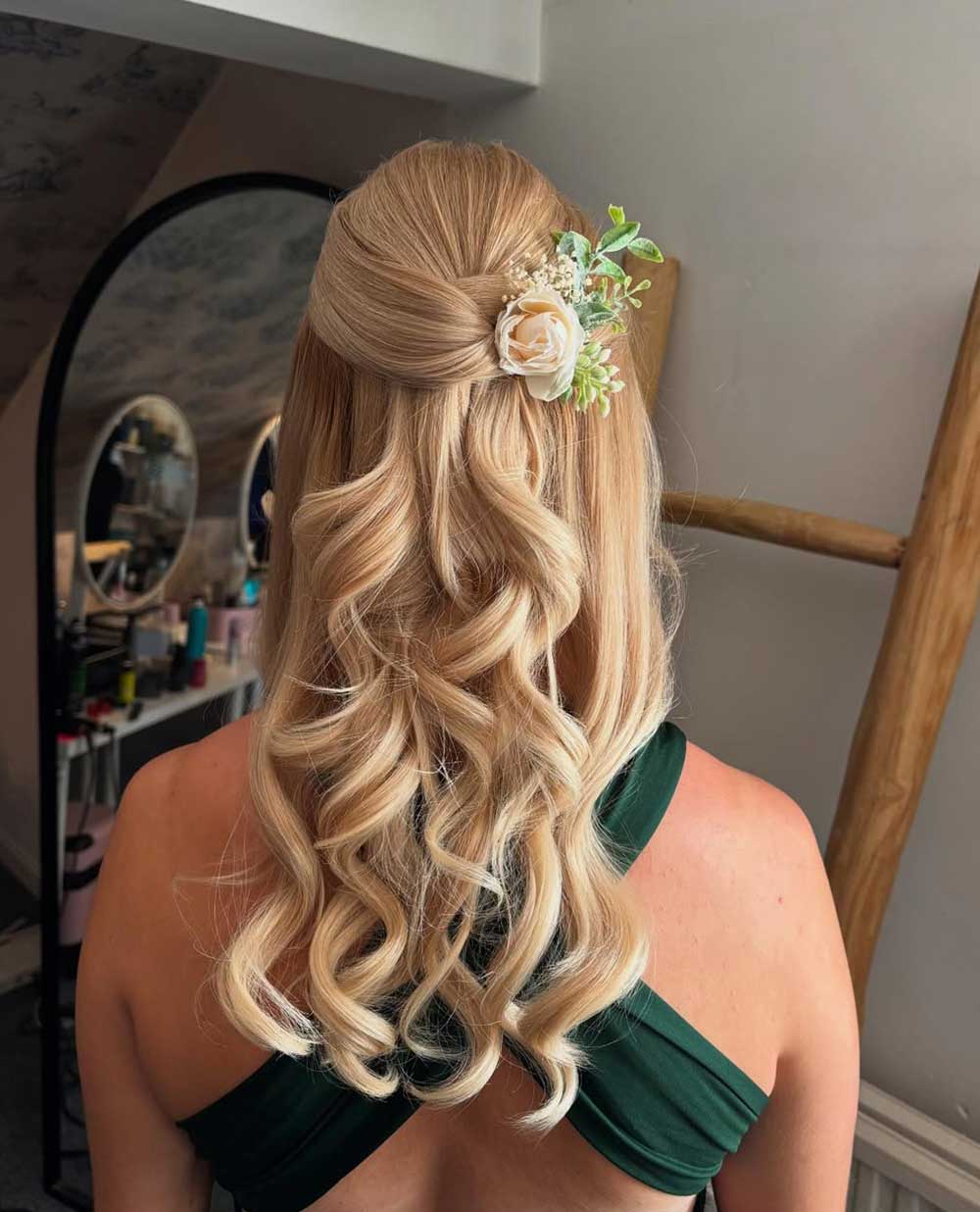 I semiraccolti sono tra le acconciature più amate dalle damigelle perché riescono a mettere d’accordo tutto: eleganza, romanticismo e praticità. Lasciano il viso in ordine, valorizzano le lunghezze, non a caso sono tra le alternative più richieste per le acconciature damigella capelli lunghi, e accompagnano la giornata senza risultare rigidi o troppo costruiti. Sono una scelta intelligente soprattutto per matrimoni diurni, all’aperto o dallo stile naturale, inoltre si prestano facilmente a piccoli dettagli decorativi come fermagli eleganti o inserti floreali discreti.