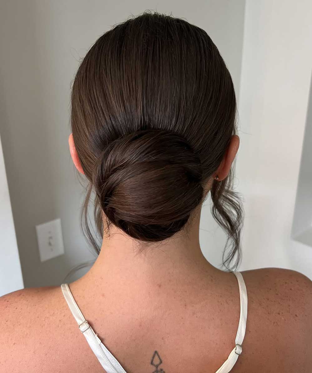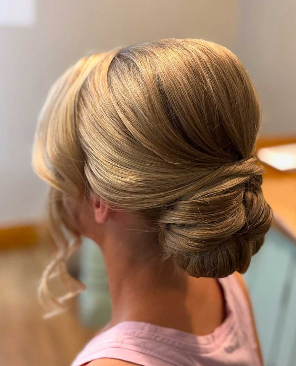 Il classico chignon basso è una garanzia: pulito, romantico e mai fuori luogo. Sta benissimo con abiti dalle linee importanti, schiene scoperte o scollature profonde, perché lascia il collo libero e mette in risalto l’insieme. Funziona perfettamente su capelli medi e lunghi, ma anche su lunghezze non eccessive se il raccolto è ben costruito e leggermente morbido.