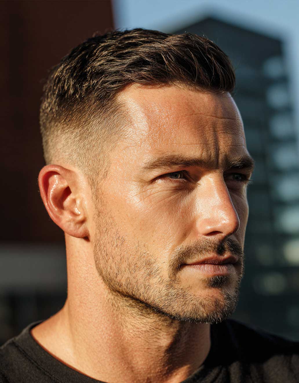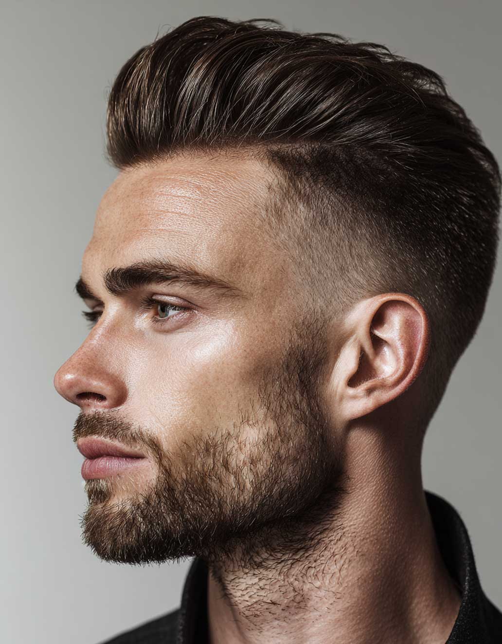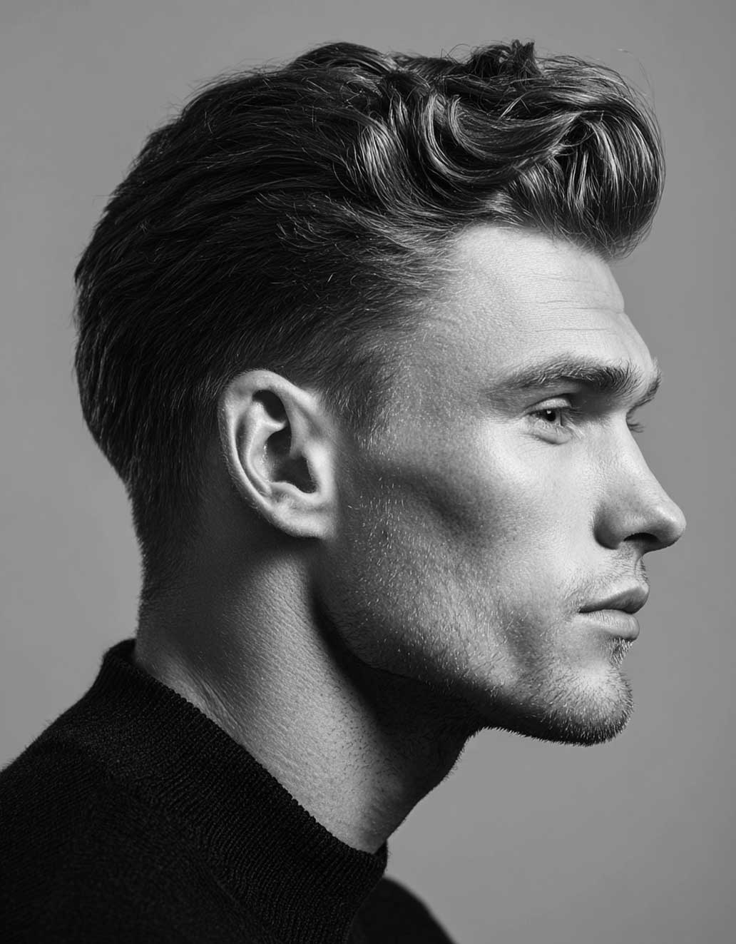 Fade con ciuffo all’indietro – Il taglio sfuma gradualmente dai lati verso la sommità, lasciando una lunghezza sufficiente per modellare il ciuffo. È il compromesso perfetto tra ordine e volume: puoi portarlo più lucido e compatto o asciutto e texturizzato, a seconda dell’occasione.