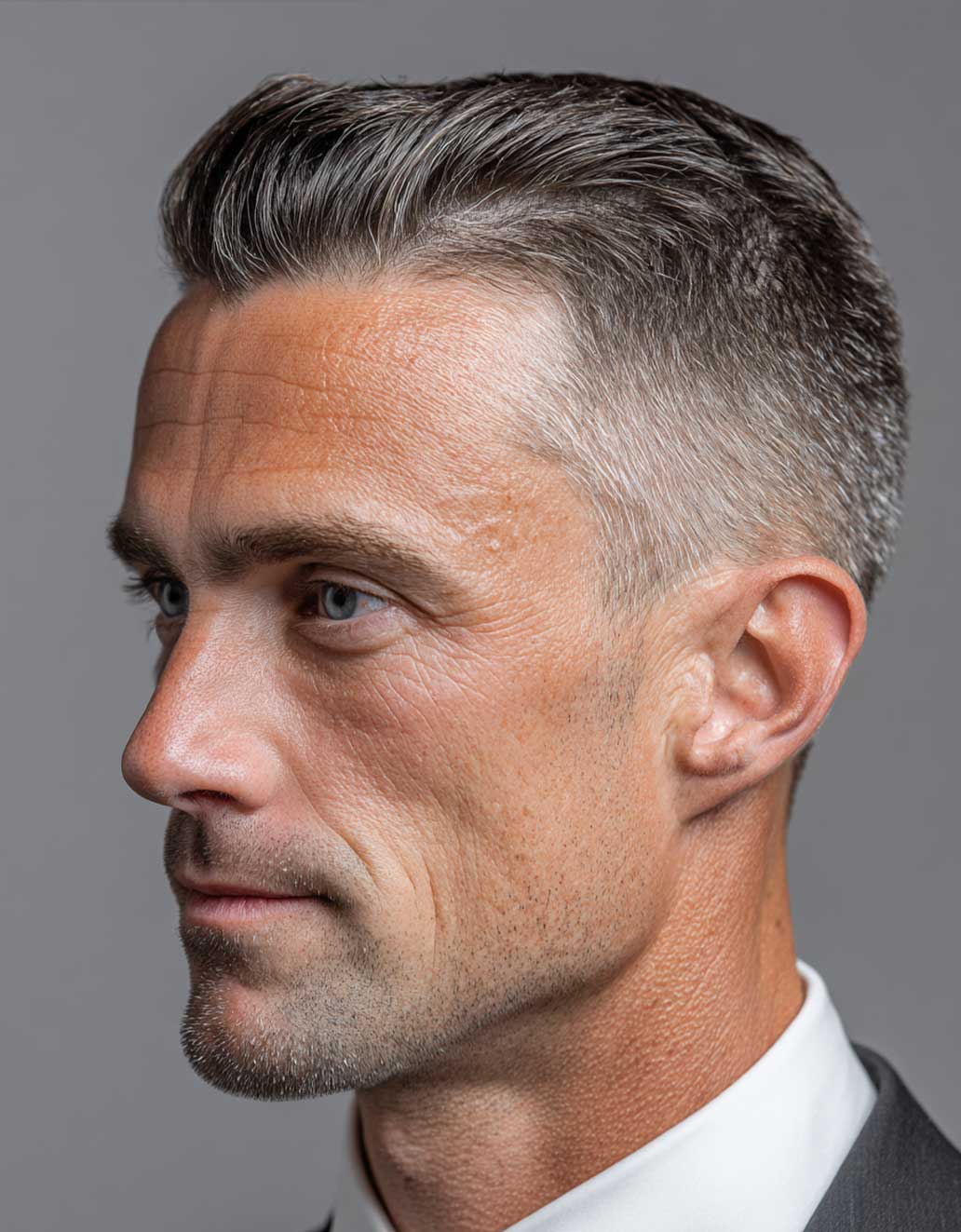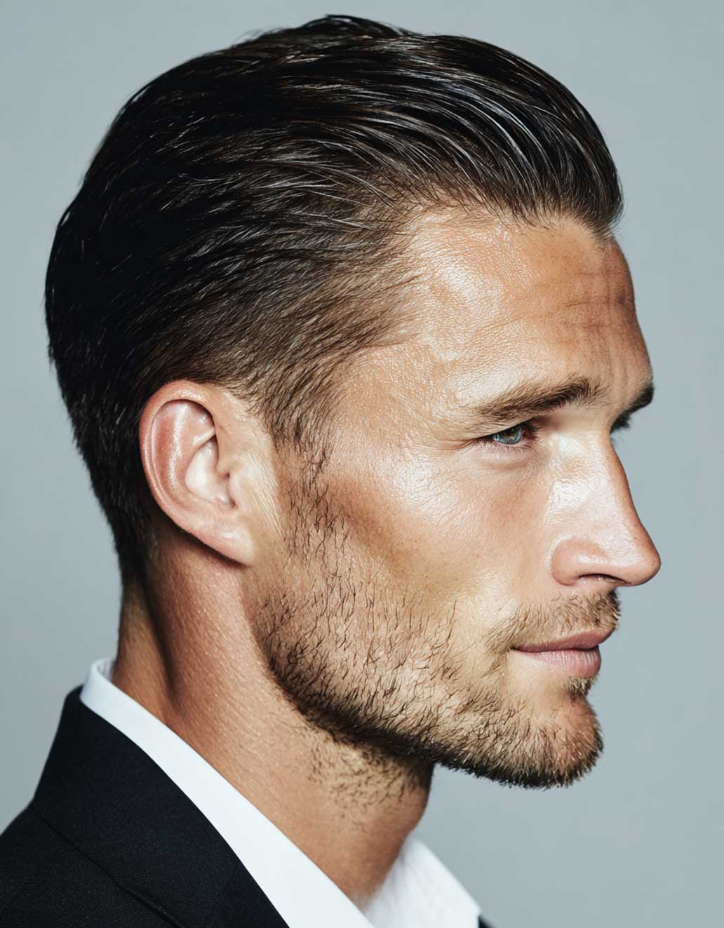 Slick Back Classico – È la versione più pulita e precisa, i lati sono leggermente sfumati e la parte superiore misura circa 4-6 cm. I capelli vengono pettinati all’indietro in modo uniforme per un effetto elegante e composto. È la scelta perfetta se preferisci uno stile raffinato e ordinato.