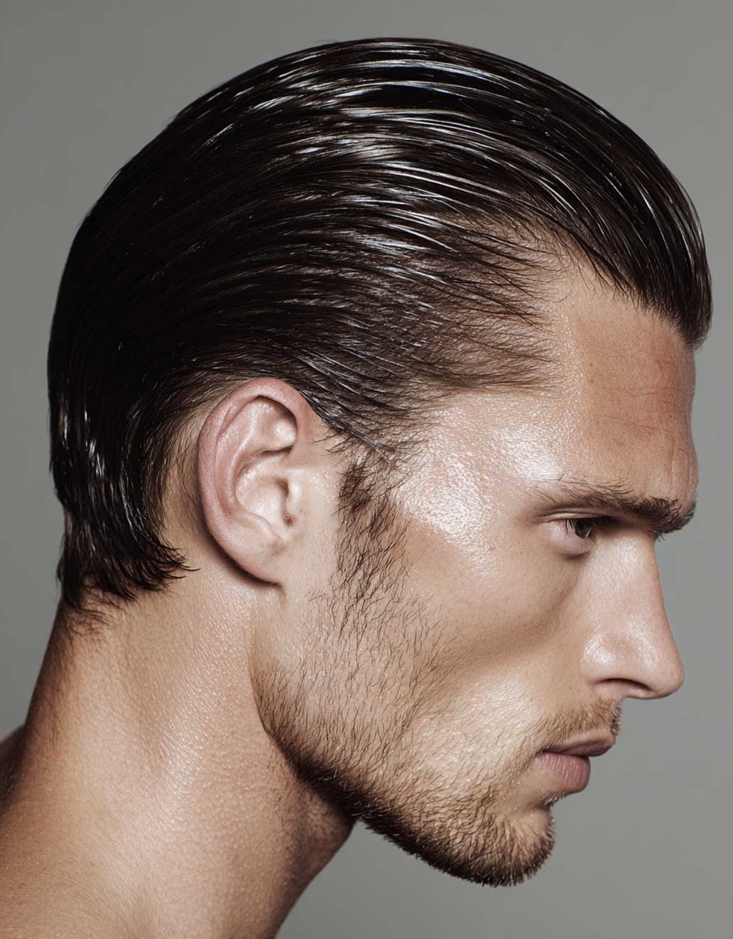 - Per un effetto wet all’indietro, distribuisci una pomata leggera o un gel flessibile su tutta la chioma, pettinando con cura per ottenere un finish lucido e compatto. È il look ideale per serate o occasioni formali.