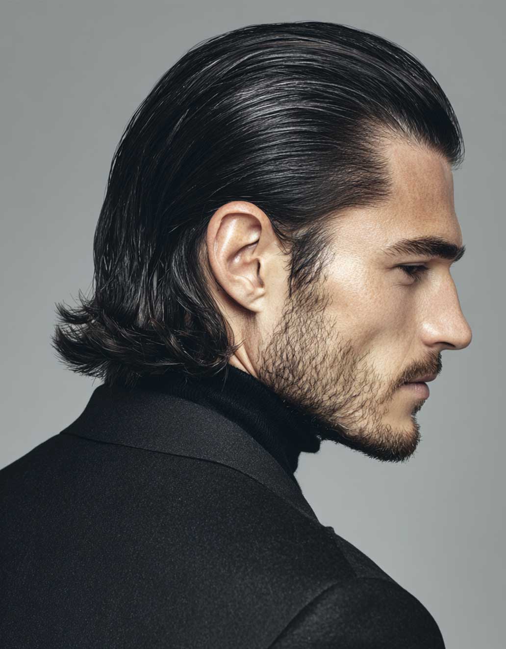 Long slick back – Capelli oltre i 15 cm, pettinati all’indietro con finish lucido o semi-lucido. Dona un effetto pieno e compatto, perfetto per chi vuole uno stile deciso e curato. Ideale per capelli spessi o mossi che mantengono bene la forma.