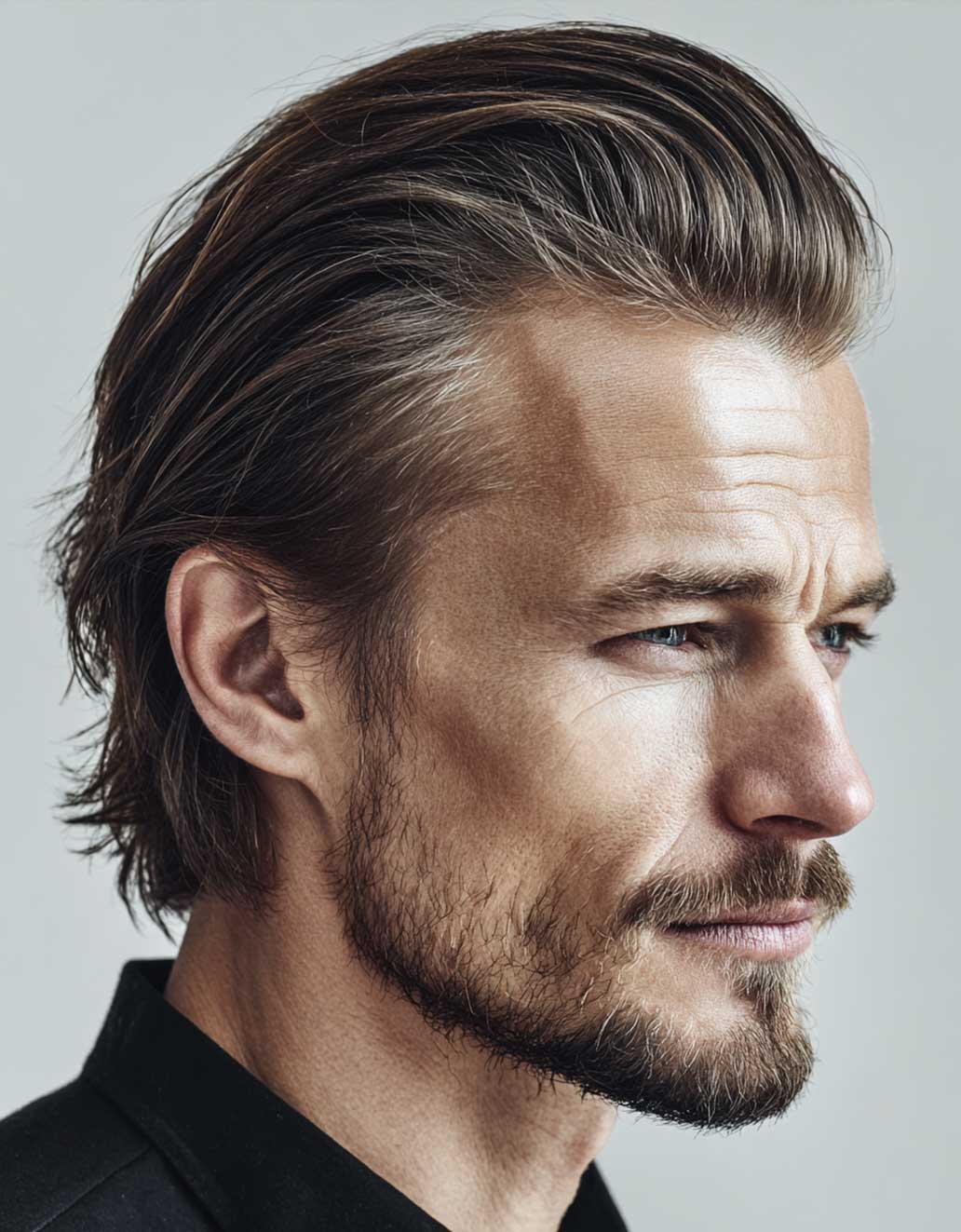 Medium slick back – Capelli di media lunghezza (10–15 cm) portati completamente all’indietro con un effetto ordinato ma naturale. È la versione più equilibrata: elegante, versatile e facile da gestire anche ogni giorno.