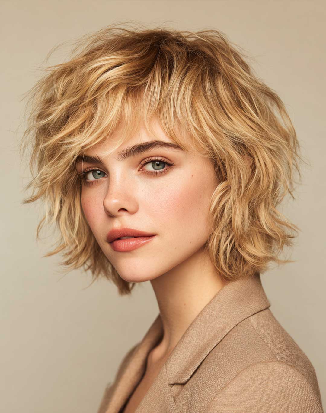L’obiettivo è creare equilibrio e volume laterale, per spezzare la verticalità e rendere le proporzioni più armoniose. Un bob corto con frangia piena o baby bang aiuta ad accorciare visivamente il volto, mentre il French bob con onde morbide aggiunge ampiezza ai lati e un tocco sofisticato. Chi ama i look più dinamici può scegliere uno shag corto scalato o un bixie con frangia leggera, ideali per dare movimento e struttura. Bellissimo anche il pixie spettinato, con ciocche sfilate e frangia morbida: la texture irregolare e il volume ai lati rendono il viso lungo più equilibrato e contemporaneo. Anche i capelli corti ricci biondi trovano armonia con un taglio extra voluminoso sui lati, che addolcisce i lineamenti e valorizza la luminosità del biondo