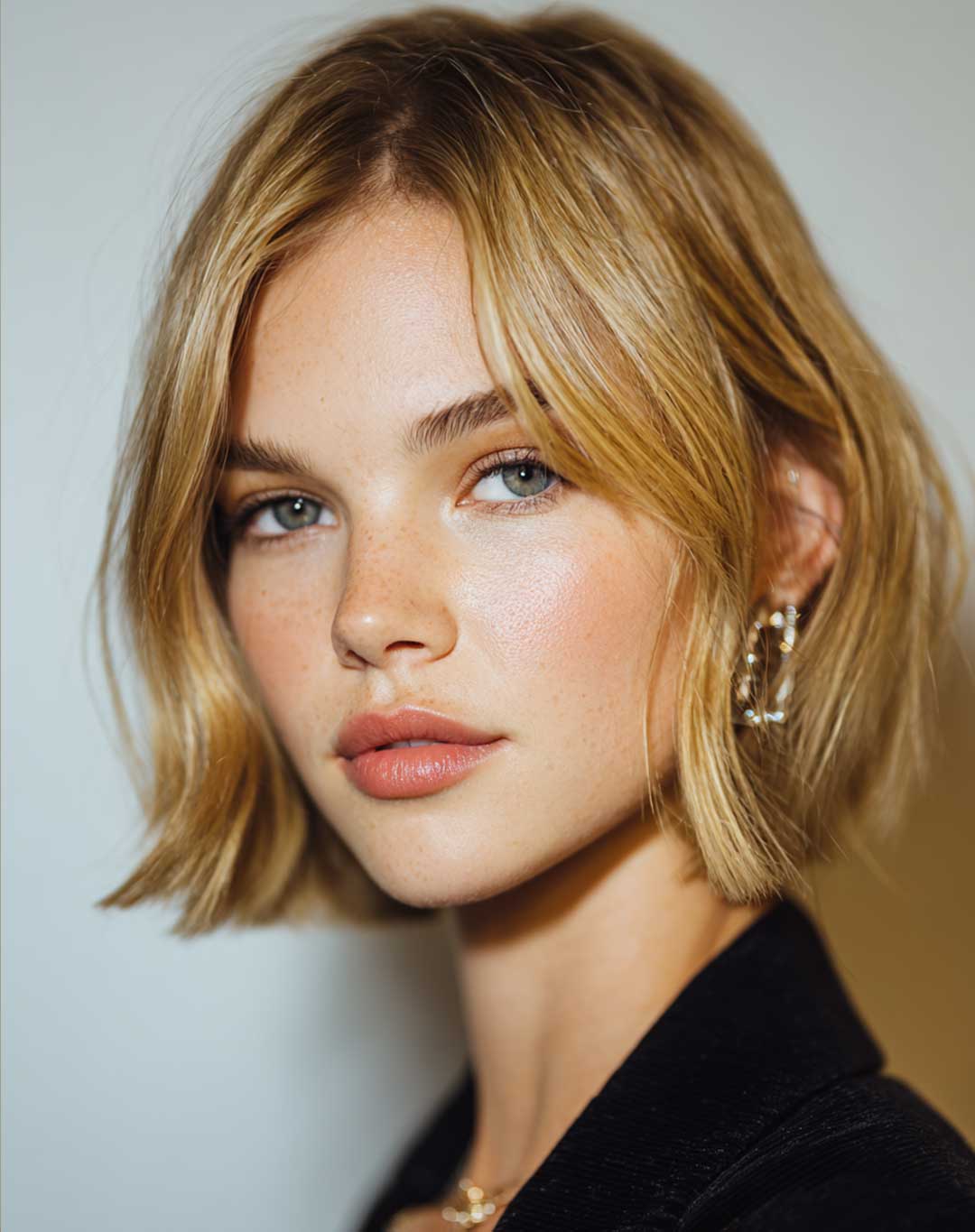 - Viso a cuore: l’ideale è bilanciare fronte ampia e mento più stretto con un short bob con frangia curtain o un bixie morbido, magari in una tonalità calda e naturale come il biondo miele.