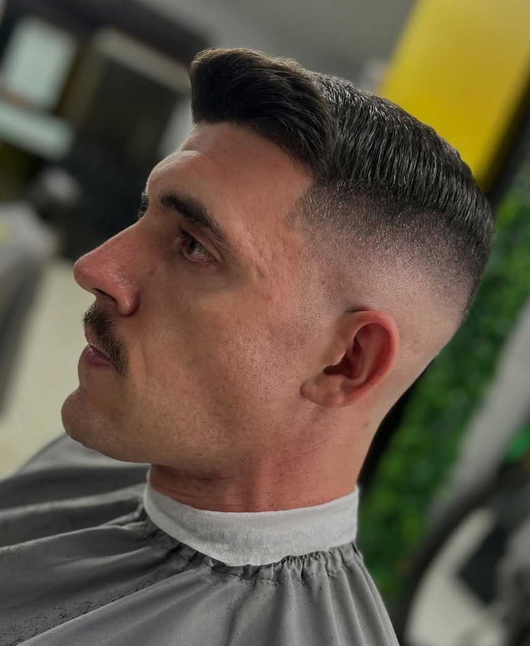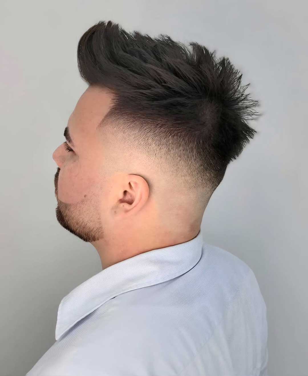Il fade coinvolge l’intero lato della testa e può partire basso, medio o alto, arrivando anche a pelle.