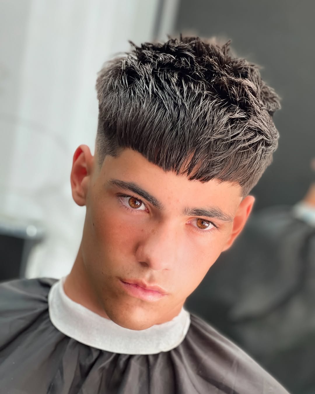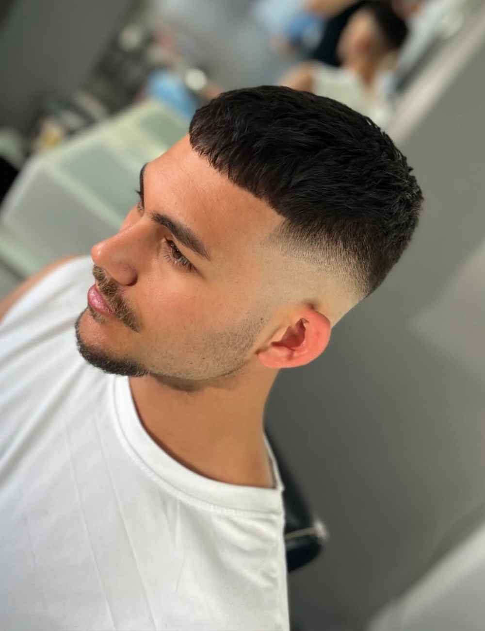 È la versione più decisa e contemporanea del French crop. La sfumatura alta parte molto in alto sui lati e crea un contrasto netto con la parte superiore, che risulta subito protagonista. Il taglio diventa più grafico, pulito, con un effetto quasi “scolpito”. La frangia può restare corta e definita oppure leggermente più morbida, ma il focus rimane sempre sul contrasto tra le lunghezze.