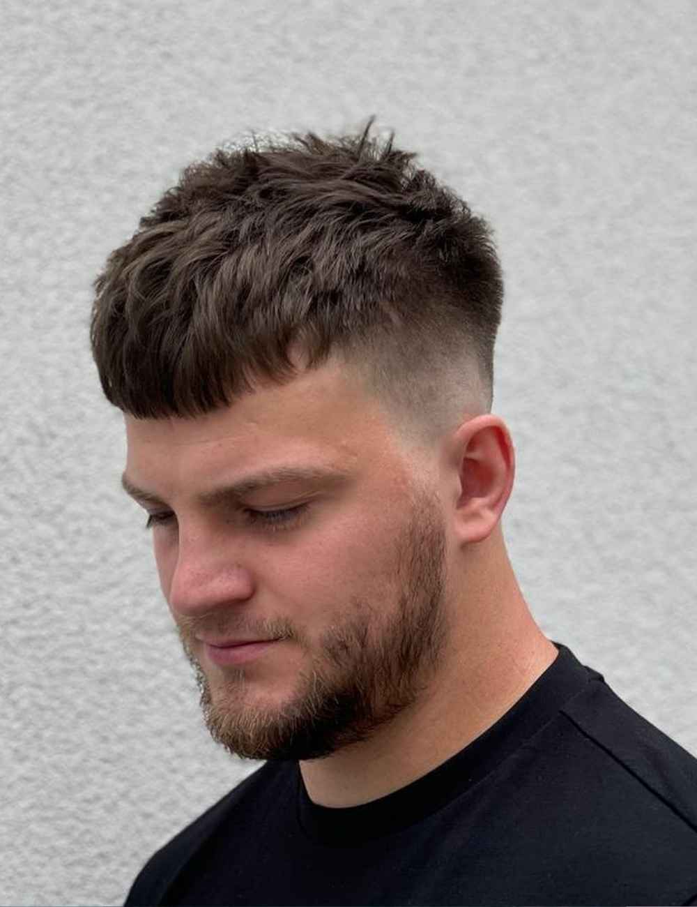 È la versione più essenziale e pulita del French crop. I lati sono molto corti, spesso sfumati, mentre la parte superiore resta compatta e uniforme, con una frangia corta e ben definita. Il risultato è ordinato, preciso, senza bisogno di troppo styling. Basta asciugare i capelli e, al massimo, lavorare leggermente con una piccola quantità di prodotto per mantenere la direzione in avanti.