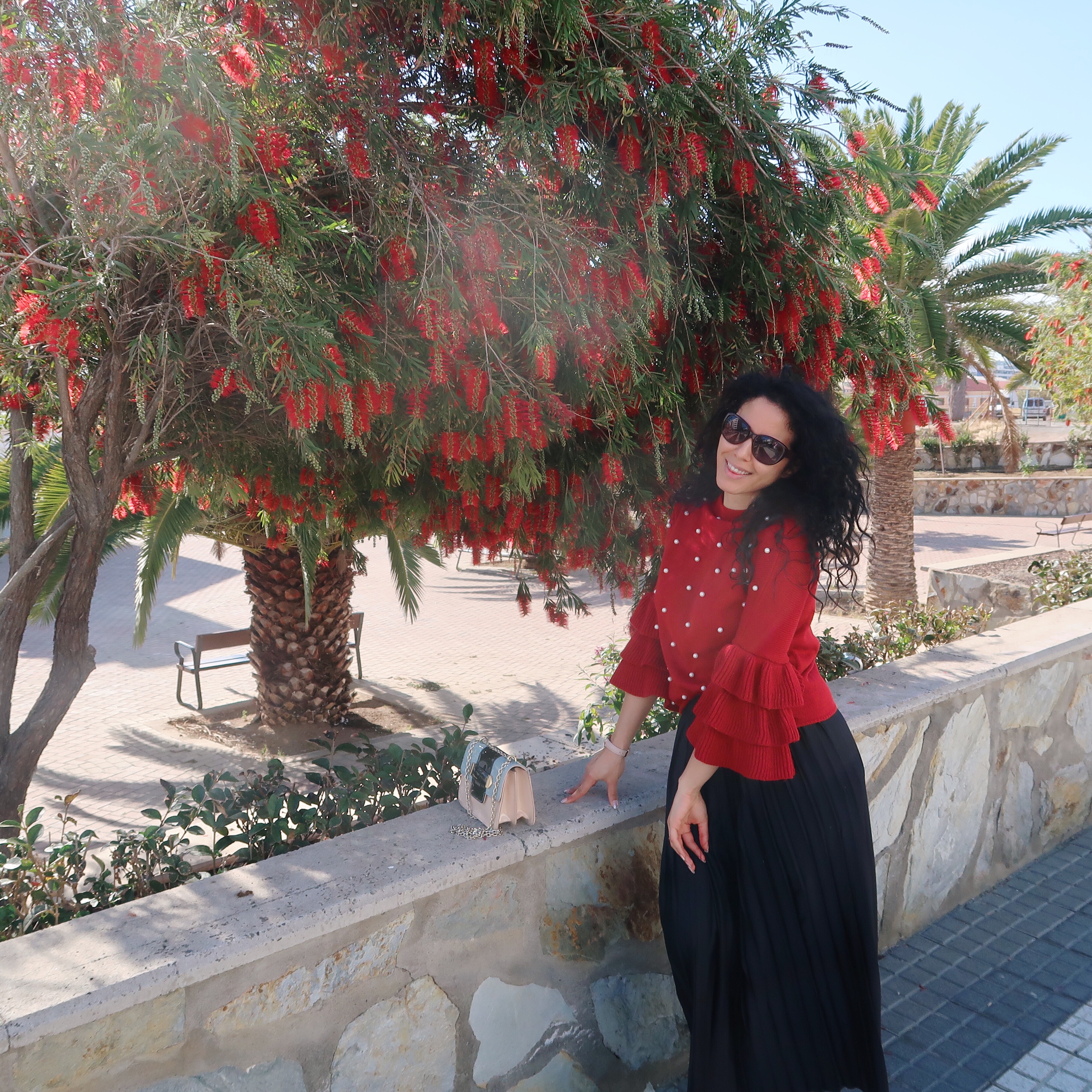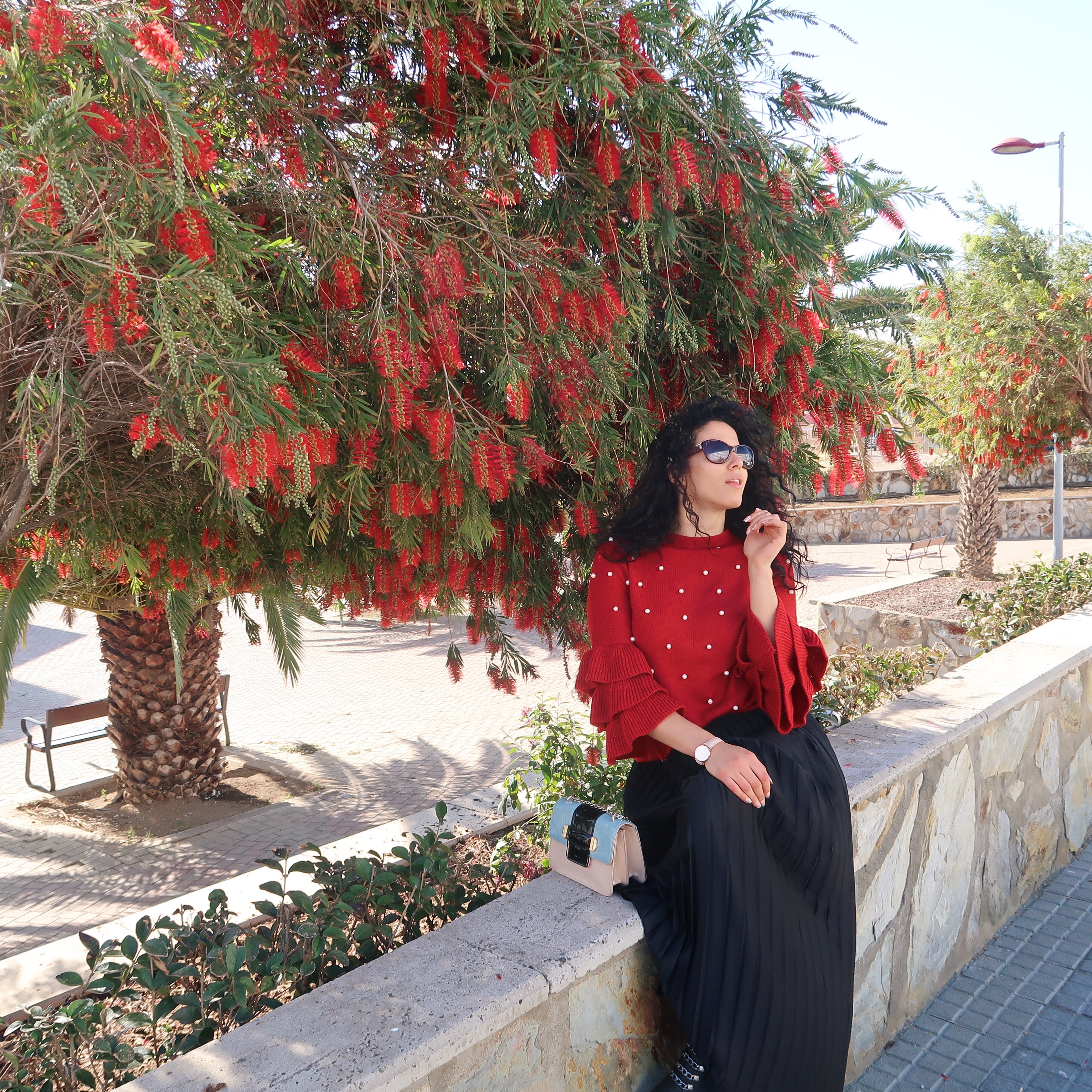 Ma questa volta sono stata previdente perché la brezza c’era e anche qualche raggio qua e la ma climaticamente parlando sono stata a mio agio! Per il mio look casual primavera 2018 ho abbinato questo maglione rosso/bordeaux arricchito con perle e maniche a campana con una gonna lunga plissettata in prezioso raso. La verità è che non è prezioso, ma il raso riesce sempre a dare quell’allure di preziosità al capo. Dimmi che non sono l’unica a pensarlo…