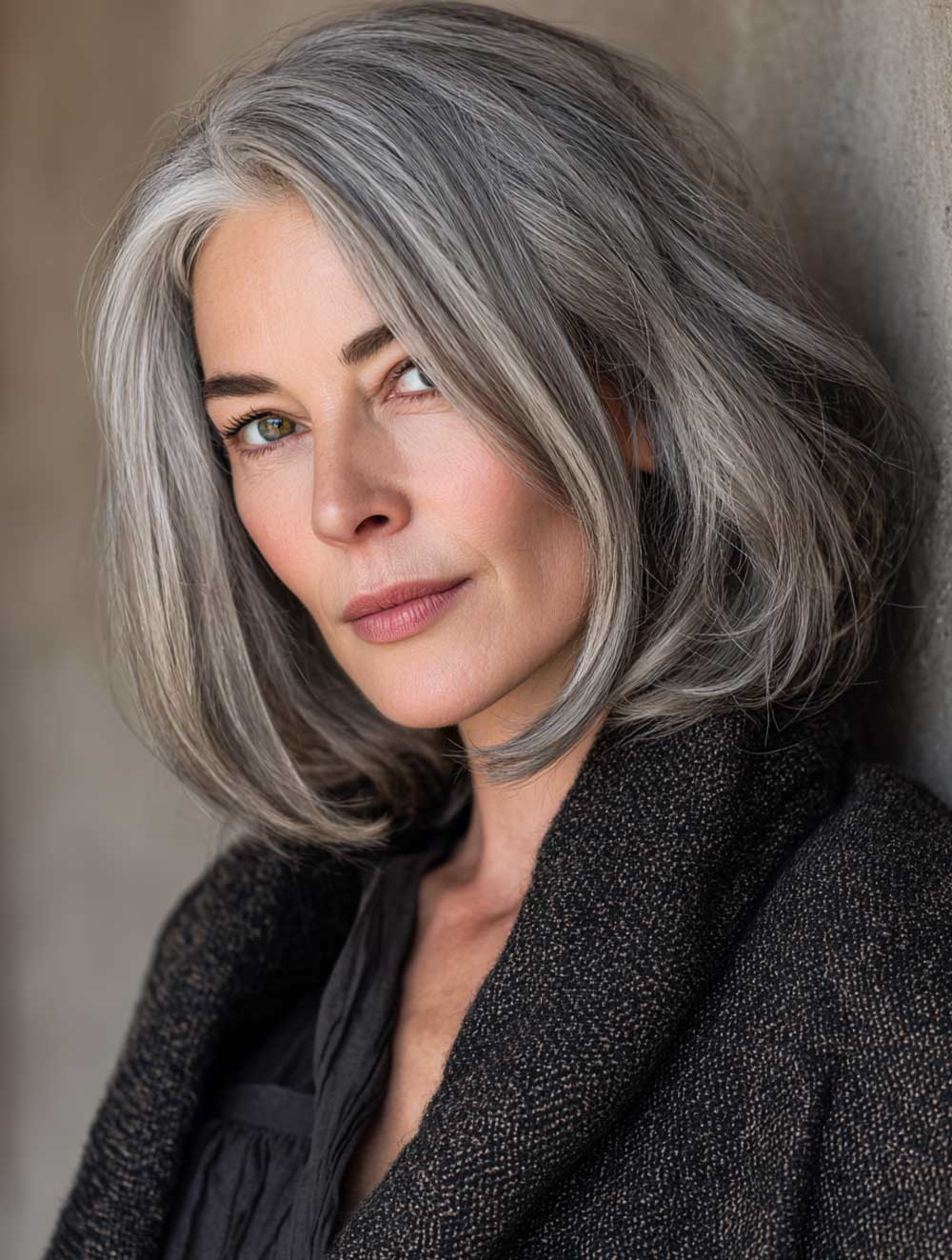 I capelli grigi medi sono la lunghezza più versatile: non troppo corti per chi non vuole rinunciare a un po’ di volume, né troppo lunghi per chi cerca praticità. Questa misura consente di variare facilmente lo styling, valorizza i riflessi argentati e si adatta a quasi tutte le forme del viso. Inoltre, i tagli medi sono ideali per gestire la transizione dai capelli tinti al grigio naturale, perché rendono meno evidente lo stacco di colore