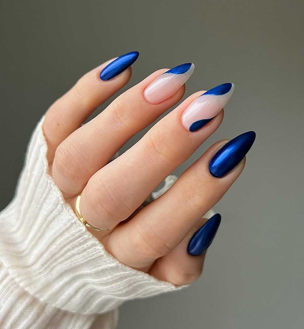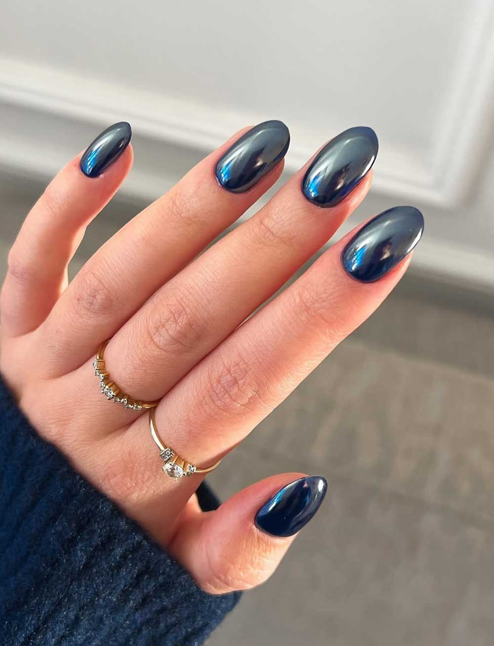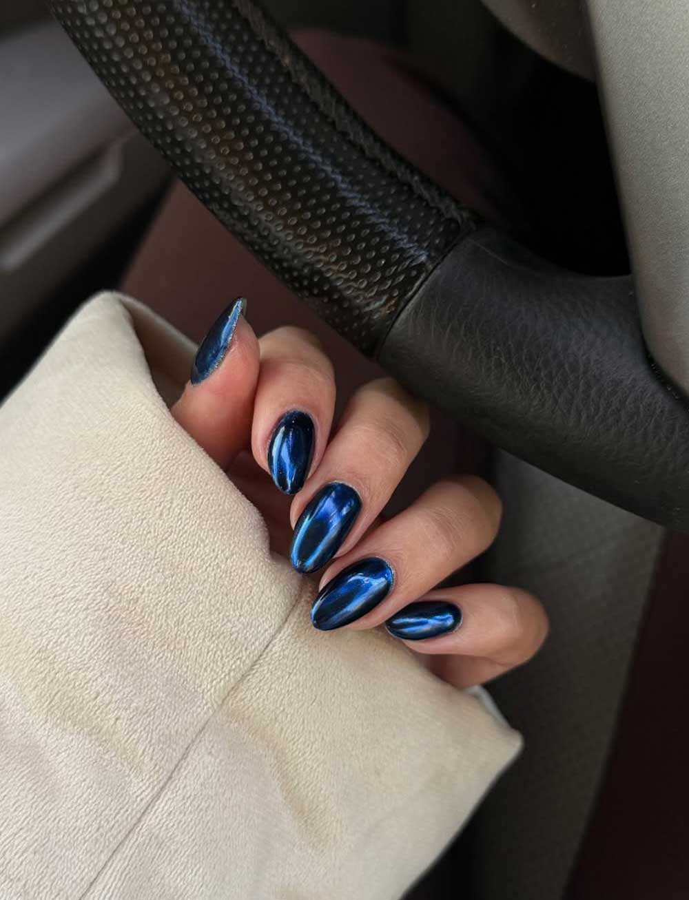 Le unghie blu scuro diventano super moderne con l’effetto cromato. Questo tipo di manicure si ottiene applicando speciali polveri o smalti che regalano riflessi metallici e specchiati, quasi futuristici. Il risultato è una superficie luminosa che cattura la luce a ogni movimento, rendendo il blu ancora più intenso e scenografico!