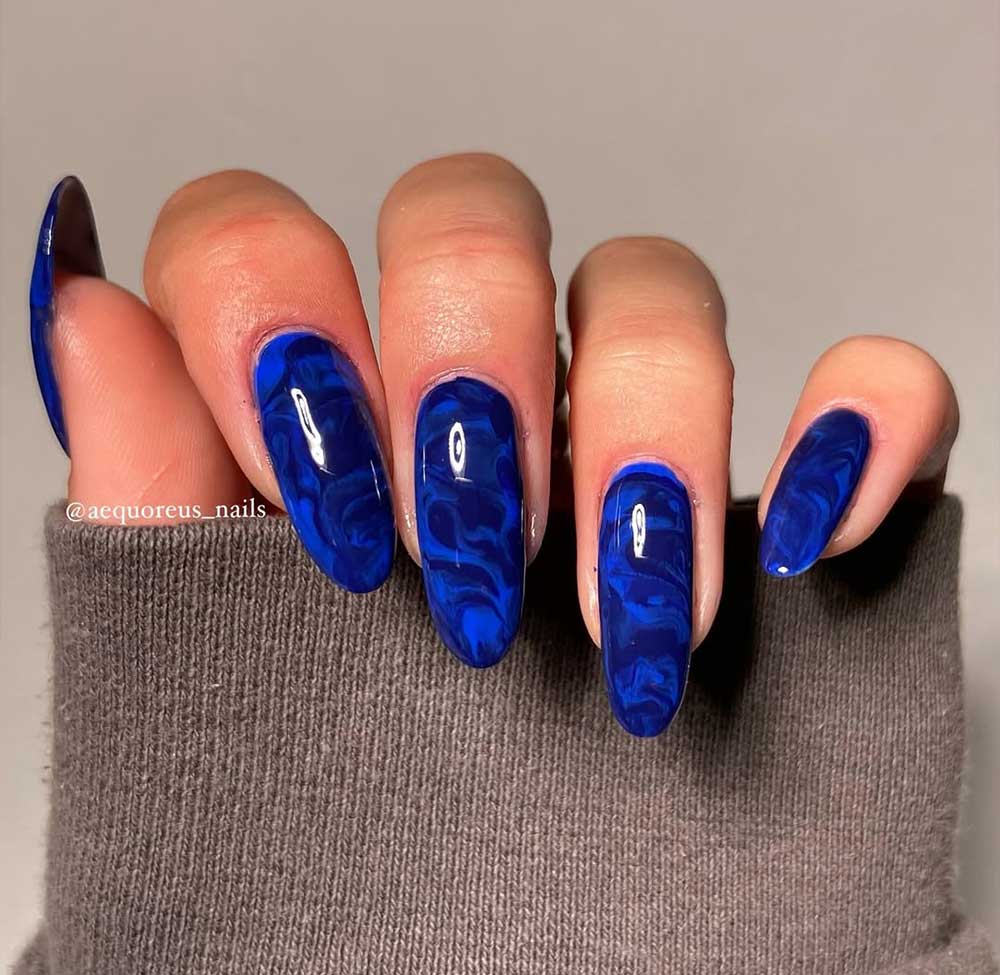 Le unghie blu effetto marble sono tra le più scenografiche, perché imitano le venature del marmo mescolando il blu scuro con tocchi più chiari o metallici. Ogni unghia diventa unica, come una piccola opera d’arte, e l’effetto finale è elegante ma creativo allo stesso tempo. Ideali per chi vuole una manicure che si faccia notare senza risultare troppo eccessiva.