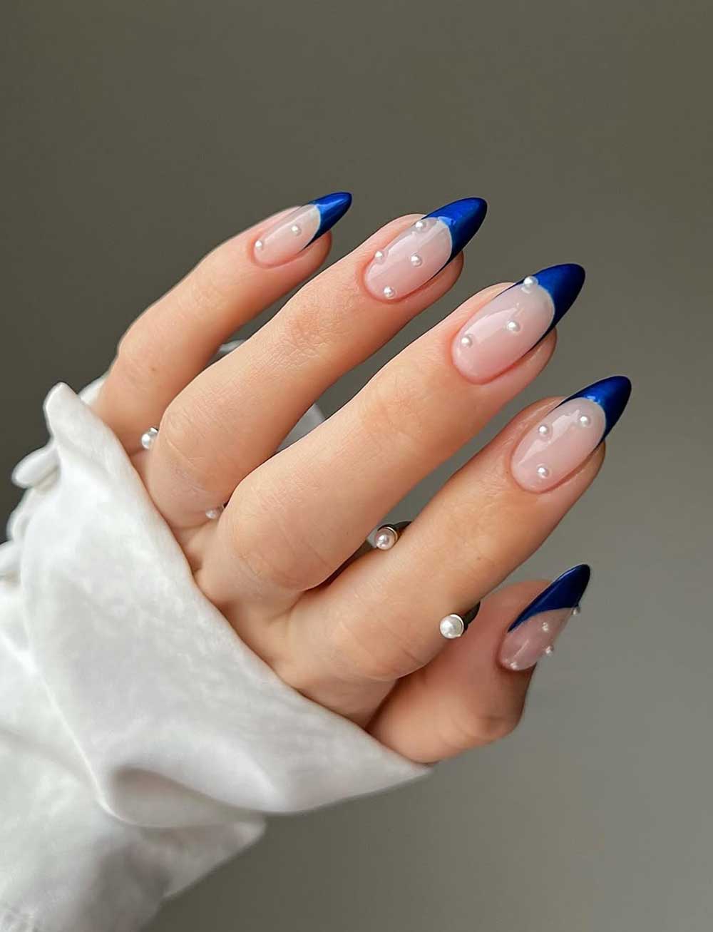 La french manicure si rinnova con il blu scuro, trasformando un grande classico in una versione moderna e sofisticata. Al posto della tradizionale punta bianca, troviamo un elegante bordo blu che crea un contrasto chic con la base nude o rosata. Il risultato è una manicure raffinata ma originale che può essere ulteriormente impreziosita con dettagli metallici, semiperle oppure con una spolverata di polvere cromata.