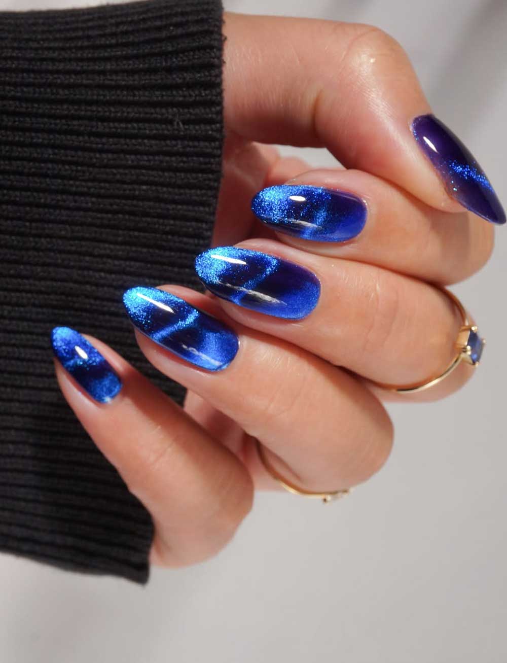 Gli smalti magnetici stanno vivendo un ritorno di tendenza anche nelle tonalità più scure come il blu navy, si applicano come un normale smalto, ma la vera particolarità arriva con il magnete, che avvicinato all’unghia crea giochi di luce e riflessi tridimensionali. L’effetto finale è profondo e luminoso, con bagliori che cambiano a seconda di come si muove la mano, rendendo la manicure dinamica e unica.
