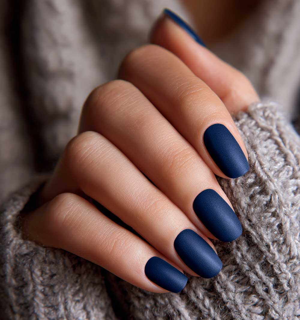 Se il glossy punta tutto sulla brillantezza, il finish opaco gioca con un’eleganza più discreta. Le unghie blu scuro opache hanno un fascino minimal e moderno, perfette per chi ama le manicure essenziali ma curate. L’effetto vellutato dona subito un’aria chic e sofisticata, adatta sia a un look quotidiano che a un’occasione speciale, senza mai risultare eccessivo.