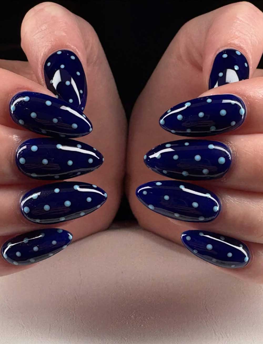 Una nail art blu notte pop e divertente: i pois bianchi o colorati sul blu scuro creano un contrasto giocoso perfetto per chi ama le nail art spiritose senza rinunciare all’eleganza della base navy.