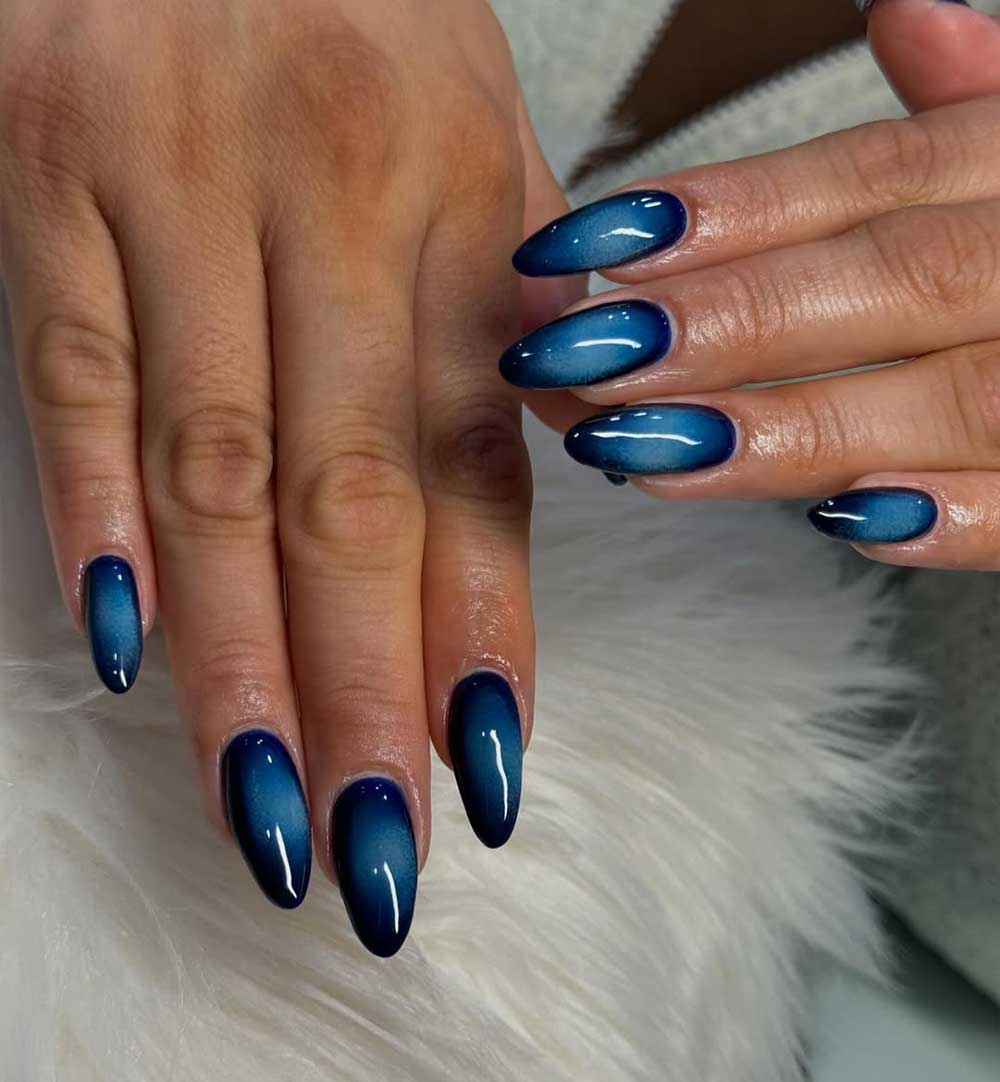 Le unghie ombré blu sono perfette per chi ama i giochi di sfumature: dal blu scuro più intenso si passa gradualmente a toni più chiari, creando un effetto morbido e super elegante. Si adattano bene a tutte le lunghezze e regalano sempre un tocco raffinato. Tra le versioni più trendy ci sono le aura nails, con il colore sfumato al centro dell’unghia che forma una sorta di alone luminoso, davvero particolare e molto di tendenza.