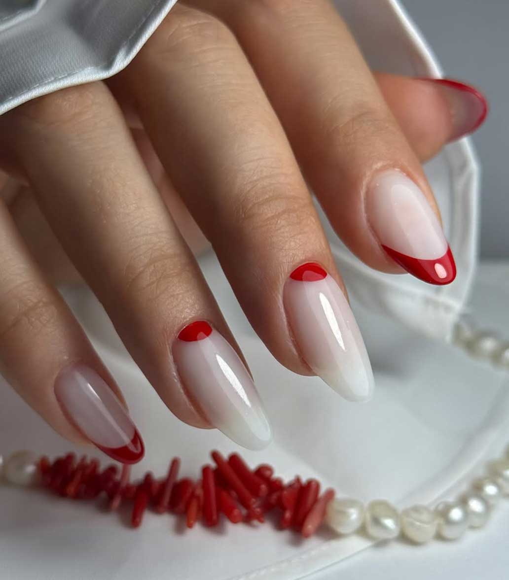 Perfette per chi ama la praticità ma non vuole rinunciare all’eleganza. Una base bianca con piccoli accenti rossi o micro pois (i famosi polka dots) è chic e divertente, mentre una micro french rossa sottile su base neutra dona subito un’aria curata. Le versioni opache o semi-lucide sono tra i trend più amati, ideali per chi cerca un look moderno ma discreto.